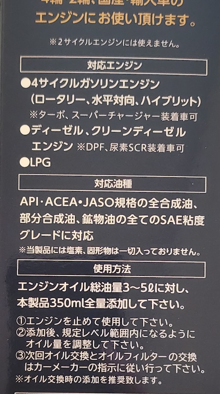パッケージによると、エンジンの機能回復、寿命延長、異音・振動・燃費の改善に効果があるとのこと。