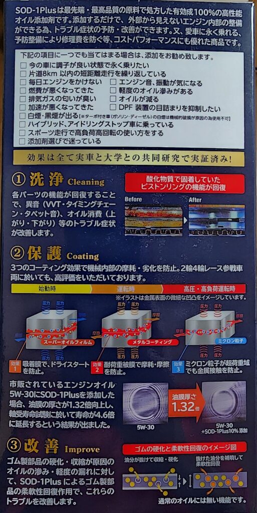 SOD-1 Plus(エスオーディーワンプラス)は、エステル系化学合成オイル添加剤で、エンジンオイルなどに混ぜることで、エンジン内部の強力な洗浄・保護、オイル漏れ・滲みの改善、圧縮圧力の回復、ドライスタート防止、燃費向上など、予防整備効果を発揮する多機能な製品です。自動車・バイクのエンジンだけでなく、AT・MT・CVT、パワステ、デフなど様々な箇所に使用でき、「機械のメンテナンス」を目的とした予防整備剤として、整備工場などでも推奨されています。